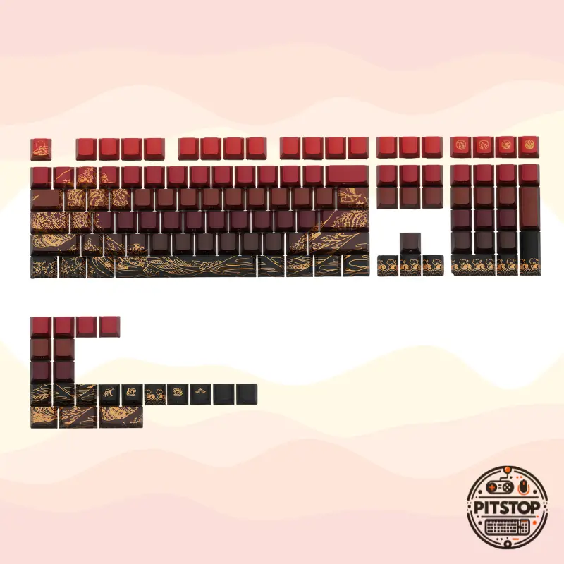 Transform your keyboard into a work of art with the Side Engraved Ukiyo Red Wave Keycaps, a 129-key set inspired by traditional Japanese Ukiyo-e design. Featuring a bold gradient from deep crimson to jet black, paired with intricate golden wave engravings, this set captures the energy of fire and ocean in perfect harmony. A true statement piece for enthusiasts who want their setup to radiate both passion and precision.