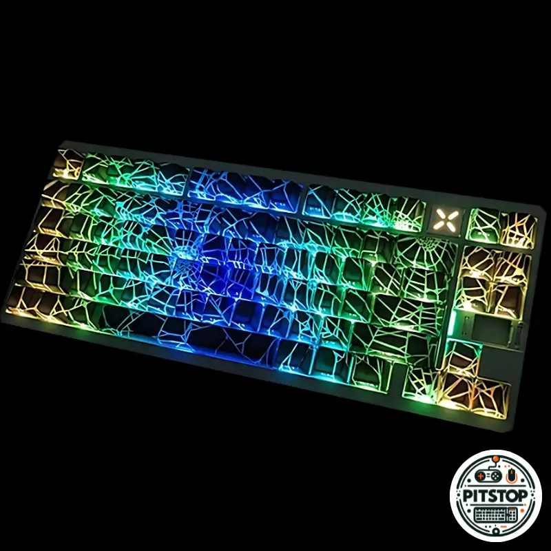 Step into the multiverse with Spiderverse Prism Keycaps – a 130-key side engraved keycap set that electrifies your keyboard with RGB-reactive spiderwebs and a cosmic neon glow.
